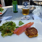 Als ersten Gang hatten wir "Saumon fumé par nos soins, galette de pomme-de terre, crême raifort" (Hausgeräucherter Lachs mit Reibekuchen und Sahnemeerrettich). Der Lachs war von bestechender Qualität und schmeckte zum Niederknien. Der Sahnemeerrettich hatte ordentlich Wumms und passte sehr gut sowohl zum Lachs wie auch zum Reibekuchen. Wobei der Reibekuchen meiner Frau äusserlich ein bisschen zuviel "Farbe" hatte; das war aber auch der einzige Ausrutscher des gesamte Menüs.
