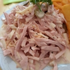 Das Schwergewicht liegt dabei deutlich im Bereich "Schnitzel vom Schwein" in diversen Variationen; Putenschnitzel muss dabei vorab bestellt werden, genau wie das Rindersteak. Ich mag Schnitzel entweder als Original Wiener Schnitzel, als Schnitzel à la Holstein oder als Rahmschnitzel. Kriege ich über Wochen kein Schnitzel, treten bei mir nicht die geringsten Mangelerscheinungen auf und ich hatte bereits im Vorfeld beschlossen, dass es hier und heute für mich kein Schnitzel geben würde. Meine Begleiterinnen schossen sich alle drei auf das Schnitzel Wiener Art mit Pommes Frites und Salat ein; die kleine Portion kostet EUR 13,90, die Normalportion EUR 16,90 und die große Portion EUR 19,90. Vorsichtshalber liessen sie sich hinsichtlich der Portionsgröße von der Wirtin beraten. "Die kleine Portion ist ein großes Schnitzel, die Normalportion sind zwei große Schnitzel und die große Portion sind drei große Schnitzel. Ich denke mal, dass Sie von der kleinen Portion gut satt werden." Also wurden drei kleine Portionen bestellt. Ich bestellte als Vorspeise "Elsässer Zwiebelsuppe überbacken" für EUR 7,40. "Da muss ich in der Küche nachfragen, ob wir noch welche haben." Sie hatten (natürlich) keine mehr. Neuer Verrsuch; ich bestellte als Vorspeise "Hausgemachte Gulaschsuppe (Rind)" (EUR 8,90). "Da muss ich in der Küche nachfragen, ob wir noch welche haben." Ich hatte es bereits geahnt; sie hatten kene mehr. Da das die einzigen Vorspeisenangebote waren, musste es für mich eben ohne gehen. Als schnitzellose Hauptgerichte konnte ich wählen zwischen "Toast Hawaii" (ein Dreifach Hoch auf Herrn Hahn alias Clemens Wilmenrod, der uns als erster Fernsehkoch der Nation nicht nur dieses Gericht beschert hat sondern auch "Arabisches Reiterfleisch" und "Gefüllte Erdberere"), Spaghetti Bolognese oder "Schweizer Wurstsalat mit Käse, Gurke, Ei in Sahnesoße und Pommes Frites" für EUR 13,40. Ich entschied mich für die eidgenössische Speise.