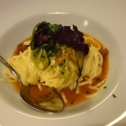 Dampfend im tiefen Teller serviert. Das Filet butterzart, ebenso die fein geschnitten Tintenfischringe. Die Rumsauce sehr dezent. Der Kürbis als kleine Würfel und Prürre. 2 locker-luftige Maisblinis dazu. Eine Beilage, die es ja selten gibt.