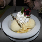 Es dauerte auch nicht lange, bis das Dessert gebracht wurde. Eine wirklich sehr gute Komposition mit verschiedenen, gut harmonierenden Aromen, süße Karamellsoße mit leichter Pfeffernote mit dem zart schmelzenden Vanilleeis und den knusprigen Mandelstückchen. Wir waren davon sehr angetan und anschließend auch sehr gut satt.