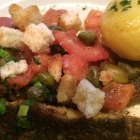 Mein Saiblingfilets zwei recht große Filets, aber unterschiedliche Größe. Die genobler Art der Zubereitung mit Zitronenstücken und Kapern wurde nicht nur geschmacklich durch die „hervorschießenden“ großen Kapern zerstört, gegen den der gut buttrige Zitronengeschmack verlor, der seinerseits angenehm durch kleine Tomatenstückchen gemildert wurde. Doch auch durch verbliebene Zitronenkerne wurde die Verwendung der Früchte deutlich gemacht. Die Kerne hätten nicht sein müssen – einer falls überhaupt wäre ein Versehen. Doch so störten die schon mal rein mechanisch jeden Genuss. Aufgrund der recht großen Kapern schoß dann zudem beim Zerbeißen ein Schwall des Einlegeessigs auf die Zunge –ebenso nicht recht angenehm –(während die großen Kapern natürlich auch leicht auszusortieren gewesen wären – aber eben deshalb hatte ich ja grenobler Art gewählt). Zusammen mit den Tomaten und Kartoffeln dennoch eine interessante Konsistenz- und Geschmacksvielfalt. Während des Essens merkte ich an, der Saibling sei umsonst gestorben, man habe ihn zudem totgebraten – angesichts der zwei unterschiedlich großen Stücke relativ logisch nachvollziehbar: Beide TK auf der Haut in die Pfanne – dann fällt einem der Köche etwas spät ein, dass das kleinere Filet evtl. doch früher raus muss als das andere – also ist dies nun schon überbraten - well-done – und das andere Stück bleibt noch in der Pfanne, bis wieder einfällt, man habe nur ein Filet aus der Pfanne genommen (das dann wohl noch in der Sonne der Wärmelampe stand ) und da damit noch viel well-doner wurde als es bereits war, tot und trocken. Im Anschnittbild sieht es zwar noch wirklich gut aus, die Zunge wie Gaumen meinten aber, es anders als die Augen melden zu müssen. Beim Lachsfilet gab es Gräten (bei mir nur eine kleine), der Baden-Badener Rehrücken war, wie mir gesagt wurde zur Hälfte überbraten, zur anderen Hälfte zu roh (aber im Durchschnitt wäre das ja dann richtig gewesen?). Bei der Salatplatte fielen sofort die Abwesenheit der angekündigten Jakobsmuscheln auf, ab-gepilgert? Erst nach der Reklamation sagte entschuldigend die Servicekraft, ja, der Koch hätte ihr am Pass gesagt, dass er keine Jakobsmuscheln habe aber dafür Gamba s draufgelegt habe - sie hätte vergessen auszurichten. Das wars. Etwas knapp, meine ich, auch die vier Gambas, die ich auf dem Teller sah, wären dann ja noch weniger – (aber ich habe ja erst kürzlich andere Erfahrungen mit Riesengarnelen machen dürfen). Dafür war der Spätzlefreund, der gestern kaum eine halbe Portion gegessen hatte, heute ganz begeistert von Spätzle uns Soße – und die Servicekraft legte gerne Spätzle nach.