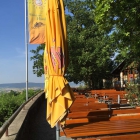 Auf der Höhe des Hörnles, mit beeindruckendem Weitblick, befindet sich ein grosser Parkplatz und ein riesiger gastronomischer Betrieb von den Ausmassen einer Autobahn-Raststelle auf einer beliebten touristischen Route. Drumherum viele zünftige Holztische, Bänke, Aussichtspunkte, ein weitläufiger Bier- und Weingarten, umgeben von Bäumen und einem Wäldchen. Da es zu regnen beginnt, gehen wir nach drinnen. Hier steppt der Bär! Riesige Hallen, proppevoll mit Wanderern, Radfahrern, Ausflüglern, Grossfamilien, herumspringenden Kindern, Einheimischen und Touristen. Fast dampft es vor feuchten Klamotten, vor Wein- und Bierseligkeit. Mittendrin mehrere Theken zur Bestellung, Essensausgabe, Geschirrrückgabe. Auch wenn das Ambiente sehr nach Massenabfertigung aussieht, lockt uns das reichhaltige Speisenangebot, so dass wir einen Versuch wagen.