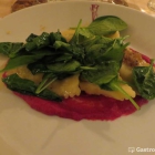 Getrüffelte Pastinakenravioli mit Rote Bete Crème und Babyspinat – das Gemüse des Jahres 2012 erweist sich als kräftige, selbstbewußte Füllung und kann, obgleich ebenfalls leicht süßlich, gut mit der Rote Bete mithalten. Herrlich frisch dazu der köstliche Spinat.