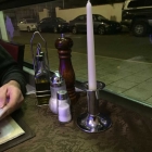 Die Tische sind eingedeckt mit weißen Stofftischdecken und braunen Mitteldecken. Darauf steht eine weiße Stabkerze , Essig und Öl, Salz-und Zuckerstreuer und eine Pfeffermühle. Das Besteck wird auf einem Teller mit einer roten Serviette an den Tisch gestellt.