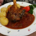Der Kellner ließ uns aber keine Chance, die Salate komplett zu verzehren, und servierte schon bald die Teller mit den Hauptgerichten. Bei Madame lag die Haxe mittig auf dem Teller und war mit fünf kleinen, ganzen Rosmarinkartoffeln hälftig umlegt. Daneben ein kräftiger Saucenspiegel und eine kleine „Salatgarnitur“, ein Tomatenviertel und ein Petersiliensträußchen.