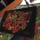 Nicht gerade warm war auch das Rindfleisch nach Art Nordwestchina. Das Fleisch war zwar sehr dünn geschnitten , hatte aber nur kurze Zeit in einer heißen Pfanne verbracht und war somit noch leicht rosa, zart und saftig, gefiel uns. Das frische Gemüse bestand aus Brokkoli, Zwiebeln und verschieden farbenen Paprika. Sehr einfallsreich. Es war noch sehr schön knackig und schmeckte auch nach deren Sorte. Die Soße war etwas dickflüssig und hatte einen schönen Geschmack, allerdings für uns sehr eingedeutscht schmeckend. Das scharf war nur durch ein paar Chiliflocken vertreten die sich sehr dezent ausbreiteten.