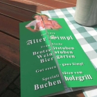 Wir hatten vorm Haus Platzgenommen. Der Biergartenbereich befindet sich auf Kopfsteinpflaster. Gleich vorm Eingang gibt es lange Holzbänke, zum Teil mit Lehnen und Holztische dazu. Dann gibt es im Pflaster eine Art Regenrinne und daneben Eine lange Holzbank und davor befinden sich die Biergarten-Klapptische und Stühle. Das sitzen hier ist etwas schwierig, da der Boden nicht eben ist. Ein paar Fleckerlteppich-Kissen liegen auf den Bänken aus, auf dem Tisch gibt es eine grün-weiß-karierte Stofftischdecke, darauf stehen ein Keramiktopf mit Besteck und Servietten. Diese haben eine grüne Farbe, das Logo vom Lokal drauf und sind etwas dünn. Zusätzlich gibt es noch einen Halter mit Bierdeckel und einen Aschenbecher. Beschattet wird der Bereich mit großen Schirmen und am Rande noch mit ein paar beweglichen kleinen Schirmen. Zum schnell was essen oder trinken ja, zum länger verweilen wäre es uns zu ungemütlich durch das unterschiedliche sitzen. 3,5 Sterne