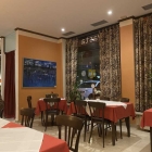 Wir wurden dann nebenan gebracht. Hier auch die dunklen Stühle, Tische mit roter Grunddecke und weißer Mitteldecke. Ein Teil der Wand ist in Steinoptik verkleidet und in den Fenstern stehen Blumenstöcke.