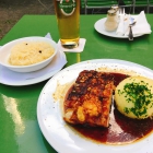 Nichts auszusetzen gab es beim Schweinebraten. Eine krachende Schwarte, die unter dem Salamander Blasen gewonnen hatte, machte dem Namen des Gerichts alle Ehre. Darunter schmackhaftes Muskelfleisch und eine würzige, typisch dünnflüssige Dunkelbiersoße, die aber dank des saugfreundlichen Kloßes vollständig genossen werden konnte. Das Sauerkraut wurde extra gereicht und war mild und schlonzig zubereitet. Einige Wacholderbeeren zeugten von typischer Würzung.