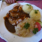 Es dauerte schon einige Minuten, während derer die Bedienung immer wieder Essen an die anderen Tische brachte, bis wir dann an der Reihe waren und sie die Teller vor uns hinstellte. Beide Teller sahen gut aus, und beide Essen schmeckten ausgezeichnet. Der Wildgulasch bestand aus ganz zartem Fleisch ohne jegliche Sehnen, der Apfelrotkohl war sehr gut abgeschmeckt und den Klößen merkte man die Eigenherstellung schon an. Auch der Spanferkelbraten (Madame hat mir natürlich wieder einen Rest übrig gelassen) war ausgezeichnet. Gemessen an dieser Speisenqualität sind die dafür aufgerufenen Preise mehr als günstig zu bezeichnen. Für mich jedenfalls eine ganz klare Empfehlung, im Gegensatz zu dem Braugasthaus am Vorabend.