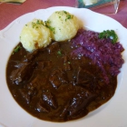 Es ist der 11.11. und wie sollte es anders sein, es gibt an diesem Tag Gans. In Form einer Brust oder Keule. Wir wählen die Gänsebrust (14,90€) und als zweites Gericht das Wildgoulasch (13,90€). Beides gibt es mit den hausgemachten Thüringer Klößen und Rotkraut. Die Teller kamen recht schnell an unseren Tisch. Alles war wunderbar zart, die Goulaschsoße war schön eingedickt und geschmacklich einwandfrei. Die selbst gemachten Knödel waren außen haarig, innen locker und mit einem gerösteten Weißbrotwürfel. So wie Thüringer Klöße eben sein müssen. Das Rotkraut war leicht zimtig und duftete nach Weihnachten. Die Gänsebrust hätte von der Haut her etwas krosser sein können - aber das ist auch schon alles, was es zu beanstanden gab. Die blankgeputzen Teller wurden abgeräumt mit der Bemerkung: "Na hier brauch ich ja nicht zu fragen ob es gut war".