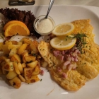 Das große Kind hatte sich heute zum Abschluss für das Schollenfilet "Finkenwerder Art" entschieden. Das Schollenfilet mit Eikruste drumherum gut gebraten, ein kleines Häufchen mit Zwiebel-Speckstippe und Rosmarin lag obenauf. Die Scholle selbst etwas lasch, ein bisschen mehr Würze hätte ihr gutgetan. Auch das Häufchen Speckstippe haben wir schon reichlicher, und krosser gehabt. Die Bratkartoffeln dagegen waren sehr gut gewürzt, mit etwas Zwiebel und Speck angerichtet. Die hausgemachte Remoulade war cremig, würzig, kleine Zwiebel-und Kräuterstückchen waren reichlich vorhanden.