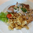 Schon wenig später werden die Medaillons mit der Pfifferling-Rahmsauce serviert, mit einem freundlichen „Lassen Sie es sich schmecken“ und wir lassen es uns schmecken.