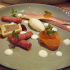 Vor dem sorgfältigem Studium der Speisekarte haben wir unsere Getränkewünsche geäußert: für meine Frau einen Sherry medium und für mich ein Ganter Export sowie zum Essen einen Heilbronner Trollinger. Zum Essen sollte es für meine Frau der "Vorspeisenteller" für EUR 11,00, als Hauptgericht der "Hackbraten mit feinen Gemüsen umlegt" für EUR 11,50 und als Dessert das "Vanilleeis mit heißen Himbeeren" für EUR 5,00 sein. Ich wählte als Vorspeise die "Flädlesuppe" (EUR 3,50), als Hauptgericht "Rehkeule mit Sauerkirschsauce, zweierlei Kohlröschen und handgemachten Spätzle" (EUR 24,00) sowie als Dessert den "Kaffee Philosoph" (EUR 4,50). Bis auf den Philosophenkaffee (man durfte darüber ob nun echter Schnaps oder ein Aroma drin war philosophieren) war alles spitzenmäßig und zu unserer vollsten Zufriedenheit. Minimalkritik bzw, Jammern auf sehr hohem Niveau: die Rehkeule hätte ich mir eine klitzekleine Idee mehr "medium" gewünscht. Ansonsten alles bestens: sehr feine Zutaten, sicher vorwiegend aus der Region, die Beilagen stimmig zu den Gerichten, sehr hübsch angerichtet und bestens abgeschmeckt. Meine Frau fand vor allem ihren Vorspeisenteller und besonders das Forellenfilet darauf ausgesprochen köstlich, war aber auch mit ihrem Hackbraten sehr zufrieden.Vom kulinarischen Verlauf unseres diesjährigen Abschlußabends waren wir ausgesprochen angetan, zumal mir auch seit Jahren wieder einmal ein Rotwein geschmeckt hatte. In der Zeit beim Bund im Schwabenland, als sich die Kameraden "stiefelmäßig" mit Plochinger Waldhornbräu oder Dinkelacker die Kante gaben, habe ich genüsslich mein Viertele Trollinger oder Lemberger geschlotzt (na gut, möglicherweise war es auch schon mal mehr als eines). In den letzten Jahren habe dann leider keinen für mich passenden Roten mehr gefunden; dieser Trollinger hat mir diesbezüglich ein Fünkchen Hoffnung gegeben:-)))