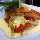 Fjordlachs auf Möhren-Fenchelgemüse, Zitronenbuttersauce und Kurkumareis - € 16,90.