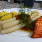 Gegrilltes Fjordlachsfilet, Mecklenburger Spargel, Petersilienkartoffeln, Semmelbutter - € 21,40.