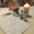 Vorm Haus, gibt es eine Biergartenbestuhlung, ein paar Blumen auf einer kleinen Mauer trennen den Bereich vom Parkplatz ab. Es ist ein altes rustikales Gasthaus was auch einen Saal mit dabei hat. Es gibt meist Vierertische, die bereits für vier Personen eingedeckt sind. Das zu viel eingedeckte Besteck mit Servietten wird beim Platznehmen entfernt. Ein paar Bilder und Krüge auf einem Regal zieren die Wände. Die Vorhänge haben Blümchenmuster und ein paar Blumenstöcke zieren die Fensterbretter. Die Servietten haben auch ein Blumenmuster und stehen zwischen dem Besteck auf dem Tisch. Dieser ist mit beigen Stoffservietten eingedeckt. Es gibt frische Blümchen, eine Kerze die bereits überall angezündet ist und Salz-und Pfefferstreuer . Hier hätten wir uns heute sehr über Mühlen zum nachwürzen gefreut. Wastels genannte Aschestreuer finden bei uns keinen regen anklang. Flyer mit Veranstaltungen befinden sich ebenfalls noch auf dem Tisch. Die Stühle bekamen als Polster eine dünne graue Filzmatte, zum länger sitzen nicht so gemütlich. Wir vergeben 4,5 Sterne.