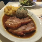 Beim Kalbsbraten gab es auch zwei Scheiben Fleisch, das allerdings etwas durchwachsen und fettig war. Kartoffelsalat war derselbe und komischer weise die Soße auch. Fanden wir nicht so schön, zum Kalbsbarten stellen wir uns doch eine andere Soße vor . Der Kartoffelknödel auch von schöner Konsistenz, mit Brotkern gefüllt und vom Geschmack her passte er. Bestreut waren die Gerichte noch mit frischer Petersilie.