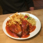 Beim Zigeunerbraten gab es zwei ordentliche Scheiben Fleisch drauf. Es war zart und saftig und auch schön gewürzt worden. Die Soße kam uns irgendwie auf Ketschup Basis vor. Sie war bestückt mit Mais ( den man sich wegen uns sparen könnte ) , Paprika und Zwiebeln ( die frisch waren ) und Champignons ( die wir der Konsistenz und dem Geschmack nach aus der Dose vermuten) .Sie war schön abgeschmeckt , nur das pikant fehlte uns. Wenn man ganz genau aufpasste und nur Soße probierte konnte man ein fitzelchen schärfe herausschmecken, das war es auch schon. Die Pommes waren unterschiedlich frittiert, mal auf den Punkt schön knusprig und innen noch weich und mal schon komplett hart geworden. Fettig waren sie nicht und bei der Salzration wurde ein wenig gespart. Die Spätzle auch keine große Geschmacksexplosion. Sehr dezent im Salzgehalt und ein wenig nochmal in Butter angebraten. Wir vermuten mal das hier ein Fertigprodukt verwendet wird .