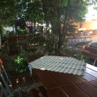 Neben dem typischen Biergarten an der Hausfront stehen auch noch Tische und Stühle . Hier gibt es überall die Klapptische und Stühle aus braunen Holz wie man sie so oft kennt. Schön wären noch ein paar Sitzkissen , aber ob man das schon darf wissen wie nicht.