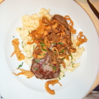 Am dritten und letzten "Kapellenabend" in diesem Jahr (13.06.15) bestellten wir als Vorspeise (natürlich) meinen Favoriten, die "Wildentenrahmsuppe mit Sahnehaube" (EUR 4,40) bzw. das "Wildentensülzchen mit Remouladensauce und Blattsalaten" (EUR 6,80), als Hauptgerichte "Rumpsteak Tiroler Art mit Meerrettich, Tomaten, Röstzwiebeln, Speckbohnen und Pommes Frites" (EUR 17,60) bzw. "1/2 Wildente in Calvadossauce mit gebackenen Apfelscheiben und Kartoffelbällchen" (EUR 17,60; die kleinere Portion hätte EUR 16,10 gekostet) und als Dessert "Bananensplit" (EUR 4,20). Getrunken haben wir Oberrotweiler Grauburgunder, Nonnenhorner Grauburgunder und als Digestif das bereits erwähnte Zwetschgenwasser aus der hauseigenen Brennerei Witzigmann. Die Entensuppe wie bisher jedesmal denkwürdig, das eindeutig hausgemachte Sülzchen ganz prima, das Rumpsteak (bis auf die Pommes) sehr rund und meine Calvadosente wunderbar; wieder aussen schön knusprig mit krosser Haut und und innen fein rosa. Wie heisst es so schön: Ente gut, alles gut! In der "Kapelle" war es nicht nur gut sondern prima; wir kommen im nächsten Juni wieder und das sehr gerne. Und vergeben jetzt schon fünf Sterne!