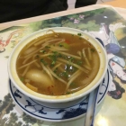 Die Brühe hatte einen sehr schönen würzigen Geschmack, aber von scharf konnten wir nichts raus schmecken. Es gab als Fleisch Hühnchen Schwein und Rind als Einlage. Es war alles sehr schön zart und saftig gegart. Das Gemüse bestand aus Champignons, Zwiebeln, Paprika , Sojasprossen und fein geschnittene Bambussproßen. Alles frisch und auf den Punkt gegart. Bestreut wurde sie noch mit frischen Schnittlauchringen. Sie schmeckte uns sehr gut, nur schade dass das scharf abging.