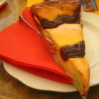 Im Service ist ein junger Kellner mit ausgesucht guten Manieren und erstaunlicher Freundlichkeit und Höflichkeit sehr rasch zur Stelle. Getränkewünsche nimmt er unverzüglich auf, für weitere Wünsche lässt er uns die Karte da. Zu meinem grossen Bedauern ist nichts Herzhaftes im Angebot. Dafür bietet das Café eine beachtliche Vielfalt an Kuchen und Torten, sowie diverse Kaffee- und Eisspezialitäten. Zur Kuchenauswahl hat man sich wieder einige Treppen hinab bis zur Theke zu begeben. Obwohl dem Süssen nicht zugewandt, beeindrucken mich rein optisch Himbeersahnetorte, Nusstorte und etwas wagenradartig Opulentes, das sich später als Blotz entpuppt. Wir wählen erst mal ein alkoholfreies Bier (3,80 Euro) und ein Haferl Kaffee (2,70 Euro). Beides wird formvollendet serviert und mit freundlichen Worten bedacht. Der Blotz erscheint mir als habhaft und nährend, deswegen bestellen wir davon zwei Stücke (je 4,00 Euro). Blootz kennen wir aus dem Schwäbischen Wald in salziger Variante als eine Art Quiche – die hiesige fränkische Variante entpuppt sich aber auch als Renner. Auf einem mächtigen, dicken, nicht sehr süssen Hefeteig thront eine massige Puddingschicht, durchsetzt von einem fruchtigen Marmeladestreifen. Erschlägt einen glatt und hat geschätzt 1000 Kalorien. Bringt aber überraschend schnell wieder Kraft und Lebensgeister zurück.