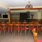 Die Tische hatten blanke Tischplatten mit diagonal aufgelegten Mitteldecken, darauf jeweils ein Keramikaschenbecher in unterschiedlichen Formen. Die Bänke hatten dunkel gemusterte Sitz- und Rückenpolster, die Stühle jeweils rote Sitzpolster. Ansonsten war deutlich erkennbar, dass der große Raum auch für unterschiedliche Veranstaltungen genutzt wurde.
