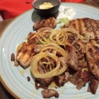 Danach die 4 Burgen Platte, 19,50 Euro. Cevapcici, Spieß, Steaks von Rind und Schwein. Tzatziki und Pommes frites.