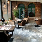 Eingetreten blickt man auf einen hübsch dekorierten Empfangsbereich, zur Linken dann ein kleiner „Bonus-Gastraum“, der unmittelbar an die Ziegelmauer eines alten Eisenbahn-Betriebsgebäudes grenzt, das man dem Anschein nach auch als Event-Location nutzt.