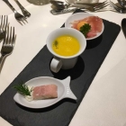 Aal aus der Mosel, leicht geräuchert auf einem scharfen Sahnemeerrettich, in der Mitte eine Kürbissuppe, sowie Schinken, ungeräuchert mit Melone. So lässt es sich in ein Menü starten. Erster Gang meiner Frau war Bresaola, Limonen-Pfeffer-Sauce, Scampi, Tomatensorbet, Feldsalat
