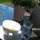 Am frühen Sonntagnachmittag finde ich sofort noch einen freien, sonnigen Tisch. Seeeehr schade, dass ich noch vom Frühstück satt bin und leider nicht schon wieder essen kann. Denn diese Speisekarte ist aussergewöhnlich verführerisch: traditionelle schwäbische Gerichte (Spätzle, Maultaschen), herzhafte Vorspeisen (toll: Bergkäse mit Feigensenf), eine Vielfalt von Flammkuchenvariationen, ein beachtliches veganes Angebot, solide Fleisch- und Fischspeisen und zu guter Letzt eine Kaffeekarte, die jedem Wiener Kaffeehaus ernsthafte Konkurrenz machen kann. Fast hätte ich einen „überstürzten Ober“ bestellt, was aber nicht passend gewesen wäre. Denn das Servicemädel war total entspannt, aussergewöhnlich freundlich, sehr zugewandt und besonders gut drauf. Mein grosser Cappuccino für 3,90 Euro wurde in einer bauchigen Tasse serviert, schmeckte angenehm vollmundig und hatte einen lockeren Milchschaum. Dazu die fast schon obligatorische Kaffeebohne in Schokoladenumhüllung. Und ein Glas Wasser, das netterweise nicht aus dem Wasserhahn kam, sondern sehr sprudelig schmeckte.