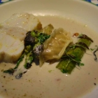 Kotelette vom Seeteufel & Taschenkrebs: In Nussbutter gebratener Seeteufel an der Karkasse - Cassoulet von Erbsen und Salatherzen - Champignons - Dim Sum vom Taschenkrebs und Erdnuss - Kokos Limetten Sud