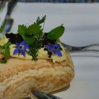 Zur kleinen Abkühlungt gab es dann hausgemachtes Zitronensorbet, bevor der Hauptgang, Kalbsrücken mit Spätzle und sommerlichem Gartengemüse gereicht wurde.