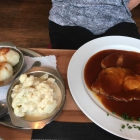 Uns gefiel sofort der Schwedenteller (13,50€) mit Forelle, Räucherlachs, Flußkrebsfleisch, Baguette und Butter. Ausgarniert mit Salat, Ei, Tomate, Zwiebeln, Gurke, Meerrettich, Zitronenscheibe, gehobelte Karotten und Paprikawürfeln. Unwiderstehlich gut mit einer erfrischenden südlichen Note. Erstklassig und herrlich aromatisch. Lob in höchsten Tönen, Genuss auf ganzer Linie. Das zweite Tagesgericht auf Empfehlung war ein Schweinebraten mit Blumenkohl in Rahmsauce und 3 Knödeln (12,80€). Die Tranchen waren auf den Punkt gebraten, fein und von guter Qualität. Der Blumenkohl in Rahmsauce wurde separat dazu serviert und hatte noch einen schönen Biss. Die Kartoffelklöße waren mit gerösteten Weißbrotwürfeln gefüllt und mit Butterbröseln bedeckt. Das Gericht war schlicht, ungekünstelt, klassisch präsentiert und überzeugte wiederum durch die Qualität der Produkte.