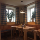 Es ist ein altes Gasthaus mit Eckbank und Stühlen in älterer Form. Tische aus hellem Holz und sehen neuer aus. Sitzbezüge bestehen aus blauen Stoff, die Vorhänge in gelb- blau kariert und die Fenster zieren Blumenstöcke. Auf dem Tisch gibt es einen Krug mit Servietten und Besteck, Bierdeckel, die Eiskarte, künstliche Blümchen und lobenswert Salz- und Pfeffermühlen. Beheizt wird der Raum mit einem Holzofen und wenn du genau davor Sitz, wird die der Arsch ganz schön heiß. Gut das sie keine Zeit zum nachlegen hatte. Für bayrische Küche würden wir sagen passt, aber für Italienisch ist es uns zu einheimisch.