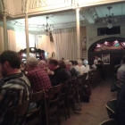 Man saß doch recht eng. Im Saal lange Tafeln, an jeder saßen 50 Personen. Insgesamt waren so über 300 Personen im Saal.