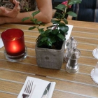 Das Bella Italia war für uns beide Parteien neu, ich bin schon öfter dran vorbei gelaufen und es war eigentlich immer gut besucht. Also vorsichtshalber vorab per Email für 20 Uhr reserviert, worauf auch innerhalb von 24 Stunden positiv reagiert wurde. Wir trafen uns mit PetraIO und Gatten gegen 19 Uhr in der VINOthek, (nicht zu verwechseln mit Videothek…) die vom Ristorante noch keine 3 Minuten entfernt liegt. Beide hatten schon kulinarisch vorgesorgt, Fräulein und ich wählten noch je ein Glas Wein bevor wir dann gegen 19:40 im Ristorante Bela Italia aufschlugen. Draußen war schon fast alles besetzt (ca. 20 Gäste). Ich schaute mich nach einem Kellner um und der erste war dann wohl auch gleich der Chef, nachdem ich Namen und Uhrzeit nannte erinnerte er sich auch an die Mail. Wir durften dann einem reservierten Vierertisch Platz nehmen. Platztechnisch ein großer Vierertisch aus Kunststoff, erinnerte optisch durch die aufgeklebte Folie an einen Holzboden mit dicken langen Fugen. Die Stühle hatten dicke Sitzkissen, mir war die Rückenlehne etwas zu steil. Es ging aber. Der Tisch war eingedeckt ohne irgendein Deckchen oder ähnlichem. In der Mitte ein kleiner Kübel mit nicht essbaren Pflanzen, daneben eine Salz- und eine Pfeffermühle. In einem roten Glas schimmerte ein Teelicht. Vier Gläser für Wasser standen Kopfüber auf Papieruntersetzern und warteten auf Ihre Bestimmung. Ein Satz Besteck lag ebenfalls auf Papierservietten bereit. Nun saßen wir also da. Wie gesagt, es war viel los.