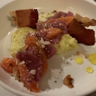 Sashimi von Lachs und Thun, Wasabi Polenta und Südtiroler Speck klang nach einer Kombination der wir nicht widerstehen konnten. Der Fisch selber in guter Sushi Qualität ausreichend dünn geschnitten, klaro mit ein wenig geröstetem Sesam kombiniert. Der Fisch lag auf einem Bett von cremiger Polenta, bei wir Beide gerne noch ein wenig mehr Wasabianteil geschmeckt hätten, das war uns etwas zu wenig. Diese Rückmeldung ging an die Küche. Crunch brachte der Speck, Fruchtigkeit ein Zitrusaromengel, insgesamt äußerst gelungen, dieses Gericht. Unsere Vorfreude auf die Hauptgänge stieg immer mehr. Hier das Hauptgericht meiner Frau.