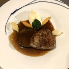 Im Menü folgt Japanisches Beef aus der Präfektur Kagoshima der Kategorie A4, also mit einem relativ hohen Marmorierungsgrad, als kurzgebratenes und geschmortes Stück. Dazu gibt es erneut eine Variation von Mais in unterschiedlichsten Texturen, etwas schwarzen Knoblauch und eine wunderbare Sauce. Ohne Frage ist das sensationell zarte Fleisch der Star des Tellers - sowohl in Konsistenz als auch Geschmack. Das Ponzugel auf dem geschmorten Würfel liefert dazu kleine Säureakzente als Kontrast zum relativ süßen Mais, so dass auch dies ein meisterhafter Gang ist, der ein Top-Produkt mit klug komponierten Beilagen, großartig in Szene setzt.