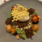 Auch beim Fleischgang ist Christian Bau das Beste gerade gut genug. Er war einer der Ersten, der überhaupt japanisches Rindfleisch nach Deutschland brachte, das lange gar nicht für den Export freigegeben war. Heute dürfen wir Tajima Wagyu genießen, das über eine einzigartige Marmorierung verfügt und zum Teuersten gehören dürfte, was Karnivoren glücklich macht. Das Fleisch ist fest mit schöner Kruste, schmilzt aber gleichzeitig durch den hohen Grad an Fetteinlagerungen förmlich im Mund. Bei einem solchen Stück gebietet es sich, dass sich die Mitspieler nicht in den Vordergrund drängen und so ist die Bau’sche Variante eines Ratatouille auch eher dezent, aber höchst akkurat gearbeitet. Karamellisierte Zwiebeln, Spitzpaprika, Zucchini und Aubergine schmiegen sich harmonisch an, ebenso wie der Anchovischaum mit schwarzem Knoblauch. Auch die Sauce ist in diesem Fall zwar gut konzentriert, aber nicht zu dominant und eher auf der eleganten Seite. Ein ausgezeichneter Gang mit erneut einem fantastischen Produkt.