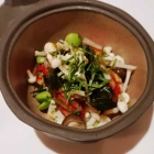 Unkompliziert die Zubereitung des thailändischen Suppenklassikers. Die Suppe wurde kurz aufgekocht. Der schlicht beschriebene Zwischengang wurde mit den hochwertigen Einlagen ordentlich aufgepimpt: Kleine Geflügelagnolotti, Garnelen, Buchenpilze, Thaibrokkoli, Sojasprossen, Koriander und Edamame sollten in der Suppe garziehen. Ich entschied mich, sie im separaten Topf gar ziehen zu lassen um sie schöner anrichten zu können.