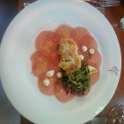 Das Carpaccio vom Kalb mit Gambas - in Sesam-Tempura gebacken - + Salatbukett (16,50 €) war meine Vorspeise. Die Scheiben vom Kalb hauchdünn geschnitten, mit Olivenöl & Zitrone perfekt gewürzt. Etwas Dressing, mit geröstetem Sesam. Einfach lecker! Es war übrigens ein Gamba, halbiert –sah aber aus wie zwei – auf den Punkt gegart Das war „verdammt“ wohlschmeckend. Eine tolle Kombination.