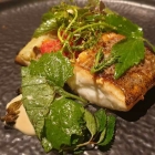 Perfekt gegarter Seehecht (ein Fisch, den ich lange nicht schätzte, aber seit einem Aha-Effekt im Durlacher Ochsen gern bestelle), wurde von einem Schaum von gegrilltem Fenchel, einer Sardellencrème und einer nicht zu festen Majonäse mit frittierten Kapernblüten begleitet. Das war einerseits füllig zum kräftigen Fisch, aber hatte durch die vielen würzig-bittrig Wildkräuter und Blüten auch das unerwartete Aroma einer frischen, feuchten Wiese. Eine lange im Ofen gegarte Tomate steuerte schließlich intensive süßsaure Frucht bei. Sehr, sehr guter Gang.