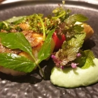Bei der Durchsicht der Fotos fiel mir optisch zweierlei auf: Zum einen, wie sehr manche Gerichte der Präsentation von Mai ähnelten. Zum anderen die Vielfalt der Teller etc., von weißem und farbigem Porzellan über Glas bis zu schwarzem Schiefer.
