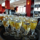 Kurz vor zehn Uhr dürfen dann die ersten Gäste „auffahren“. Wir sind wohl mit der 5. oder 6. Fuhre dran. Der Aufzug schafft ca. 12 Personen und muss jetzt Höchstleistungen bringen. Oben angelangt werden wir kurz begrüßt und uns werden die Jacken und Mäntel abgenommen. Es wird Zeit die fantastische Aussicht zu genießen – atemberaubend! Dann tritt die Bedienung an den Tisch und lädt zum Sekt ein. Dieser ist gekühlt (aber nicht eiskalt), trocken, aber nicht „staubig“. Insgesamt gut trinkbar. Natürlich wird der Sekt auch als Gemisch mit O-Saft angeboten.