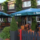 Seitlich des Restaurants befindet sich ein großer, schattiger Biergarten. Einzig die herabprasselnden Kastanien schmälerten die Freude am draußen sitzen. Die Tische und Sitze im Außenbereich rustikal aus stabilen Holz, für zarte Popo´s gab es noch nicht mal Sitzkissen. Stundenlang hält man es da auch nicht drauf aus.