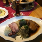 Es dauert auch nur wenige Minuten, da kamen auch schon die Haxen. Eine große Portion mit schöner krosser Haut und zartem Fleisch. Nach meinem Geschmack hätte die Haut ein wenig würziger (Salz) sein können. Dazu gab es Kartoffelsalat, der mit Essig, Öl und einer Fleischbrühe gut zubereitet war und dann noch etwas Krautsalat, der geschmacklich eher zu der süsseren Variante gehörte. Obendrauf die Kirschtomate, Peter3 hätte seine Freude gehabt.