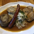 Bayerisches Krautschmankerl – Der Jungschweinebraten war super zart und saftig gegart und auch herrlich gewürzt worden. Die Soße war die gleiche wie bei der Haxe. Das Wammerl hatte einen sehr guten Geschmack mit einer schönen Räuchernote , war schön weich gekocht das man auch die Haut mitessen konnte. Dazu gab es frischen rassigen Meerrettich. Das Weinsauerkraut hatte einen schönen Weingeschmack, aber für ein Sauerkraut dürfte es für uns mehr Säure haben, es schmeckte etwas süßlich. Verfeinert war es noch mit Kümmel. Der Semmelknödel hatte eine etwas festere Konsistenz wie wir sie mögen, war aber doch etwas fluffig. Vom würzen her gab es nichts zu meckern. Der Leberknödel war uns ein wenig zu weich geraten und hier fehlte uns ein wenig der Pep, der Lebergeschmack. Ansonsten war er schön gewürzt worden.