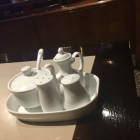 Zum nachwürzen gab es hier ein Porzellanschälchen in dem sich eine Schale mit Sambal Olek befand, ein Kännchen mit Sojasoße und Salz-und Pfefferstreuer.